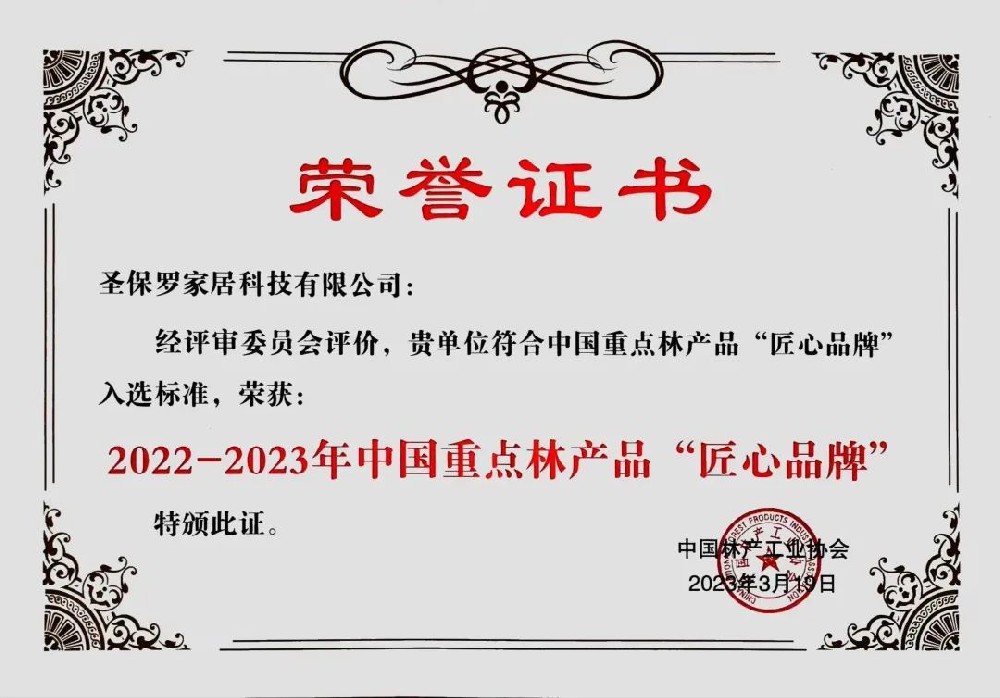 圣保羅家居科技有限公司獲得第一批重點林產(chǎn)品“匠心品牌”榮譽